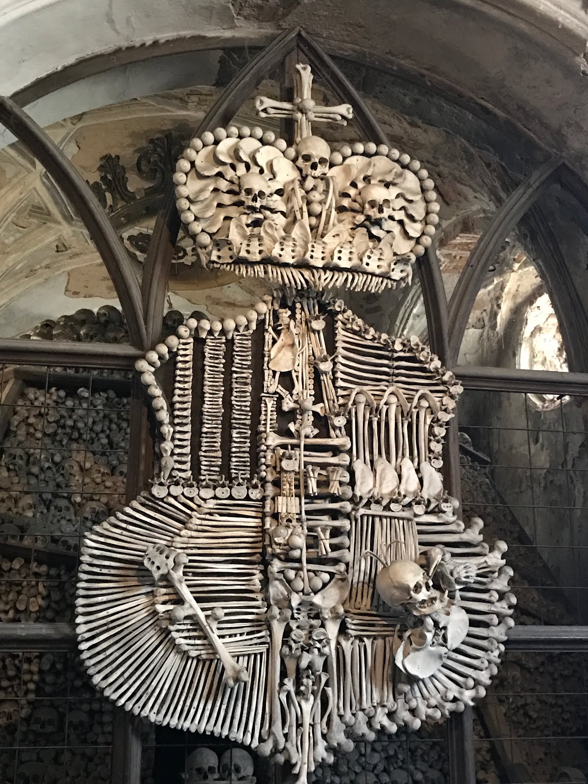在教堂裡面可以看到用人骨做成的水晶燈、裝飾、金字塔、甚至是如下圖的徽章